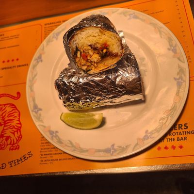 Like a burrito, but Indonesian! Jasmine rice, mie goreng, tempe orek & Sambal Chicken.
