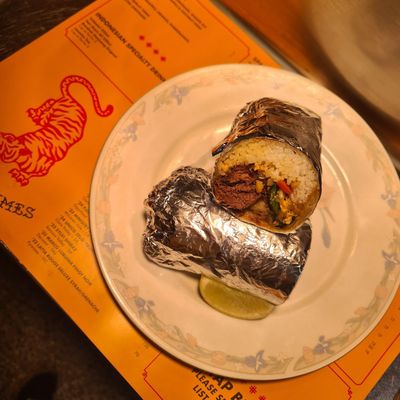 Like a burrito, but Indonesian! Jasmine rice, mie goreng, tempe orek & Beef Rendang.