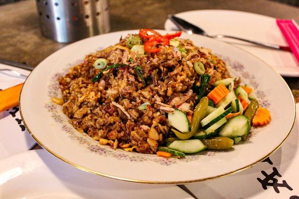 (GF, V) Fragrant Javanese-style fried rice with eggs and fresh spring onions, served with tangy acar (pickled vegetables).