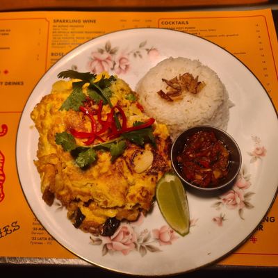 (GF, V) Indonesian egg omelette w spring onion, shallots, chilli and served w steamed rice, acar & Sambal.
