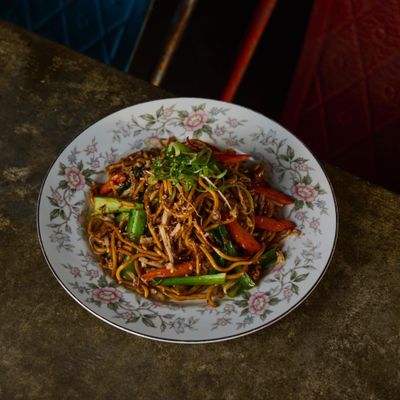 (V) An iconic Indonesian street style stir-fried noodles w eggs, choy sum, carrot, bean sprout & chilli paste.
