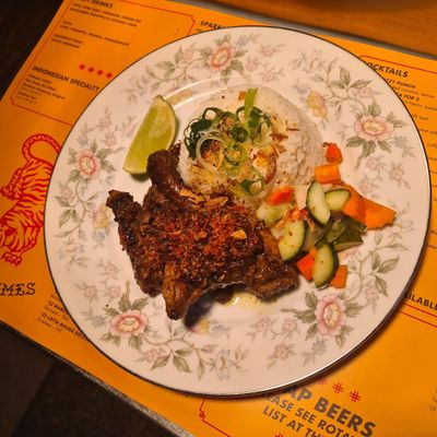 (GF) Two mouth-watering skewers of West Java inspired marinated beef, coated in sweet soy sauce and a side of tangy acar.